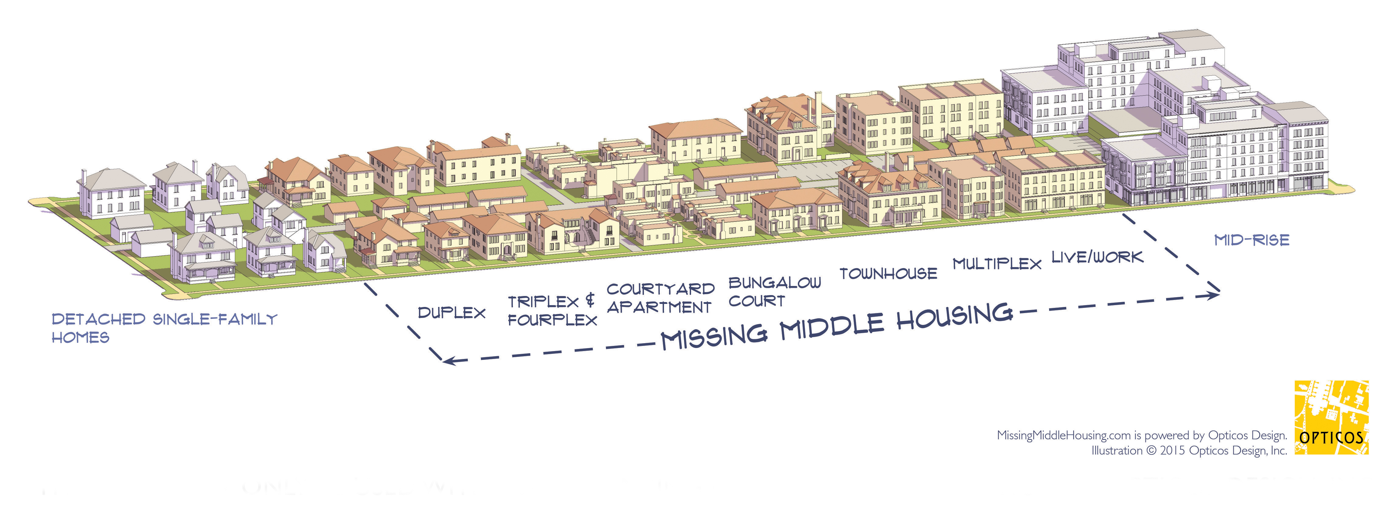 “Missing Middle Housing” is a term coined by Opticos Design founder Daniel Parolek to describe a range of housing types that match the look, feel, and scale of single-detached homes, yet include two or more homes. It exists in the “middle” of the housing-density spectrum, between single-detached homes and high-rise apartments.