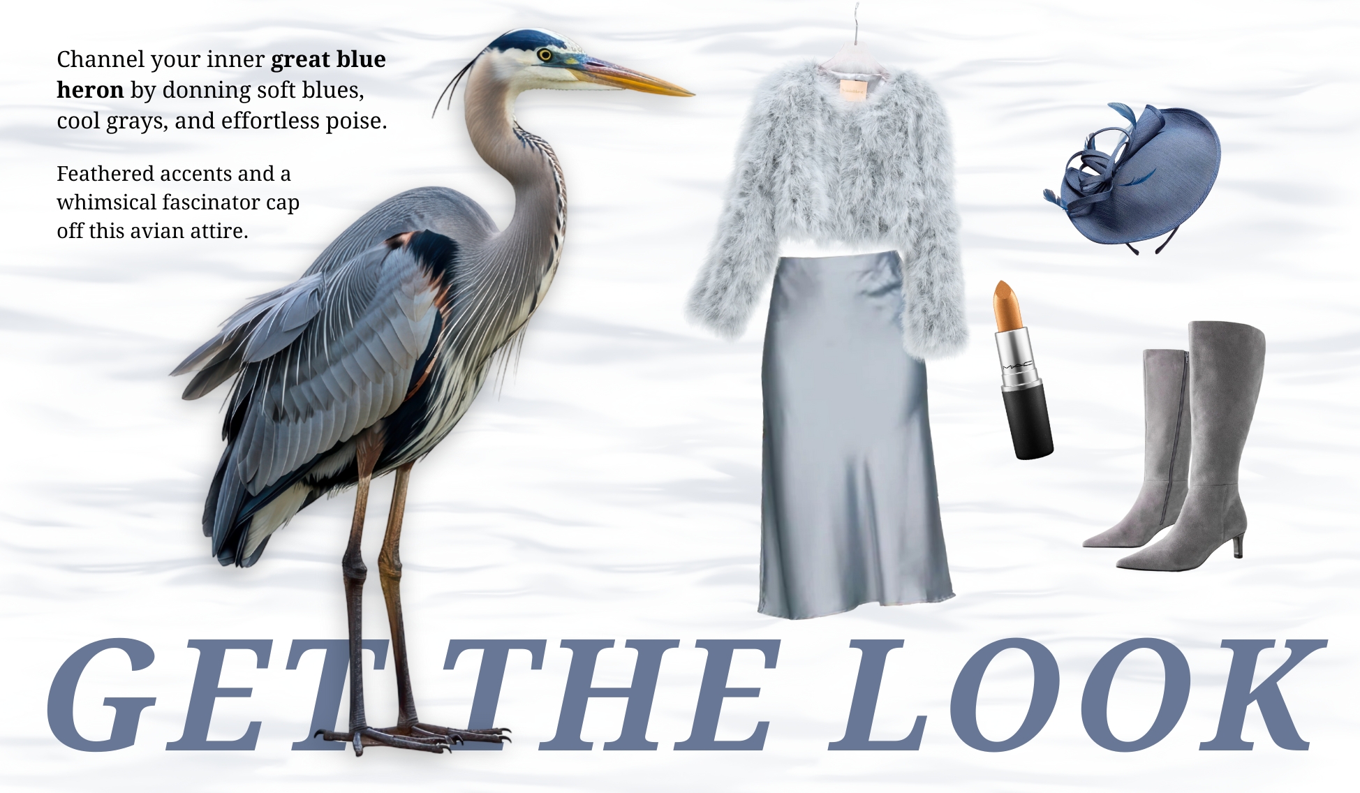 Elegant and poised, the great blue heron brings soft blues, grays, and flowing lines to your Halloween look. Think long silhouettes, feathered details, and understated accessories that echo the grace of this iconic wetland bird.