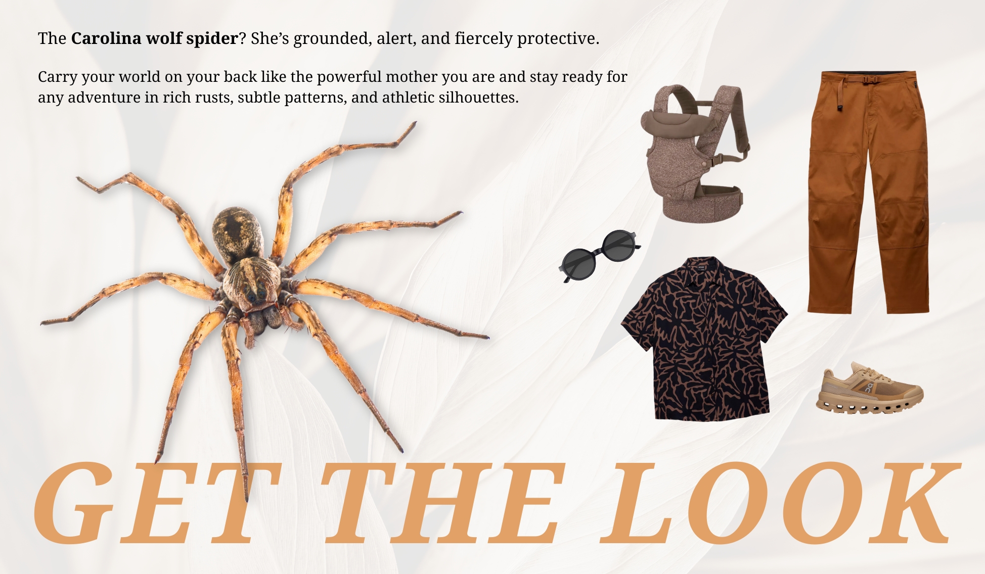 Shades of brown and gray, grounded textures, and movement-friendly pieces make this look powerful yet understated. A nod to the Carolina wolf spider’s protective side — she carries her young on her back — adds a layer of meaning beneath the costume’s laid-back look.
