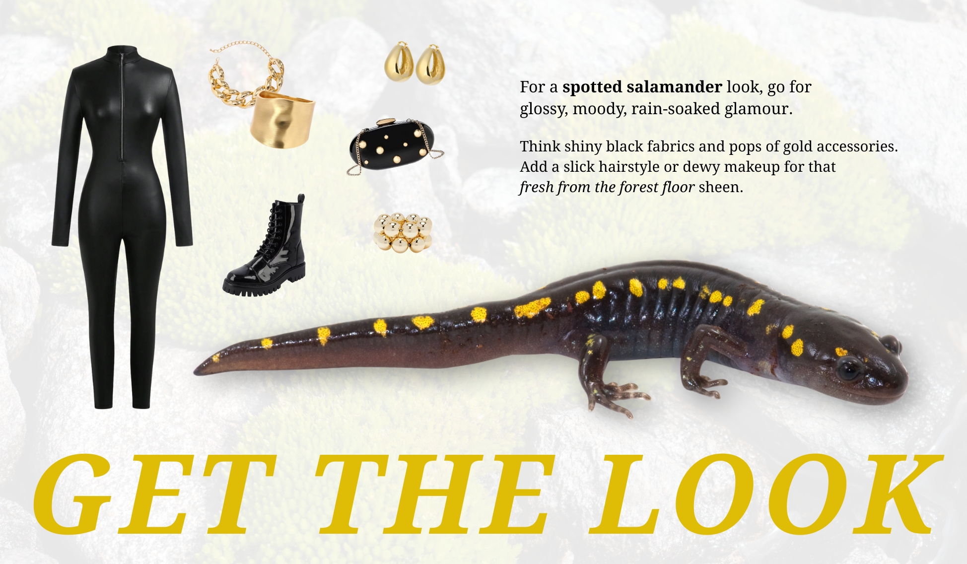 Dark and mysterious, the spotted salamander provides perfect inspiration for a rain-ready, forest-floor-chic costume. Dark glossy fabric accented with pops of gold capture the salamander’s playful glow.