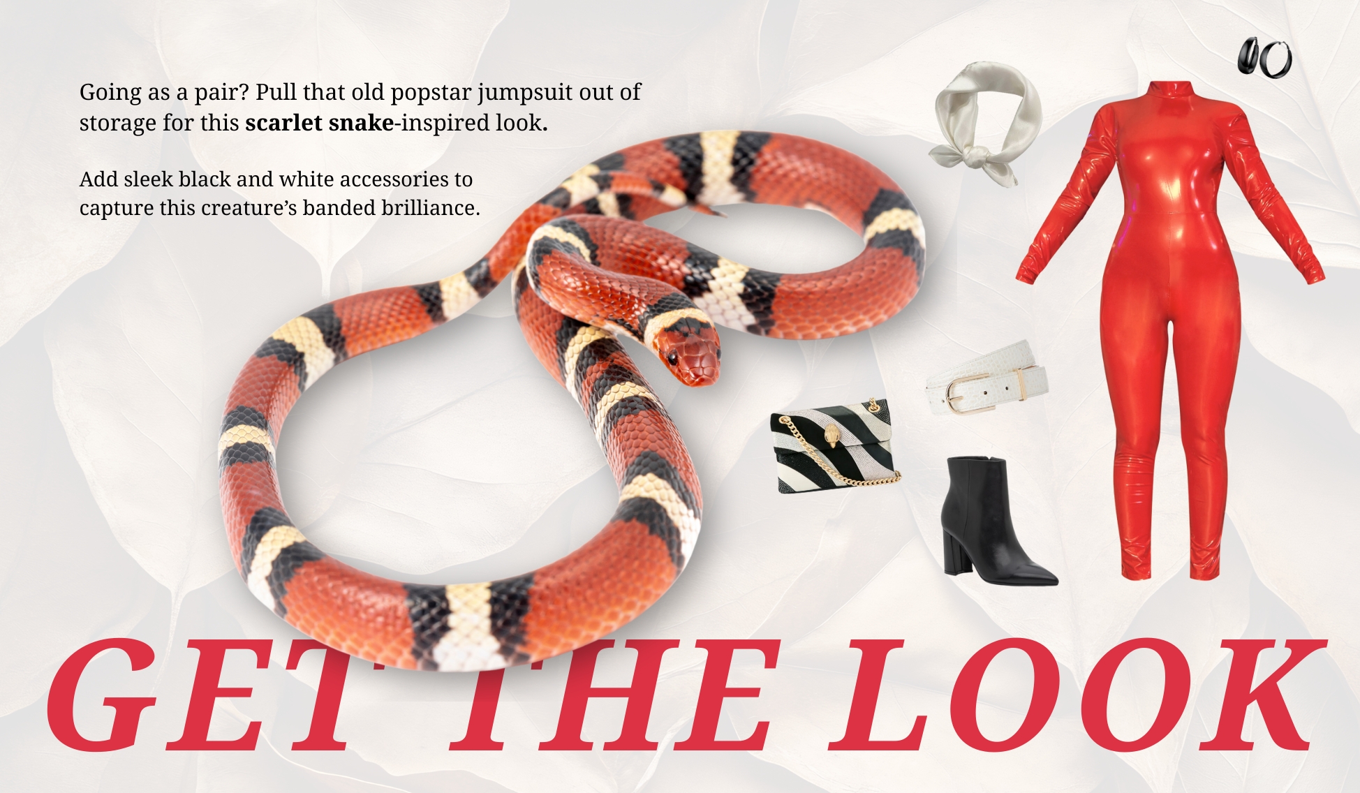 Group costume, anyone? For a subtle but striking statement, the scarlet snake’s crimson, black, and cream pattern easily transforms into a bold Halloween ensemble.