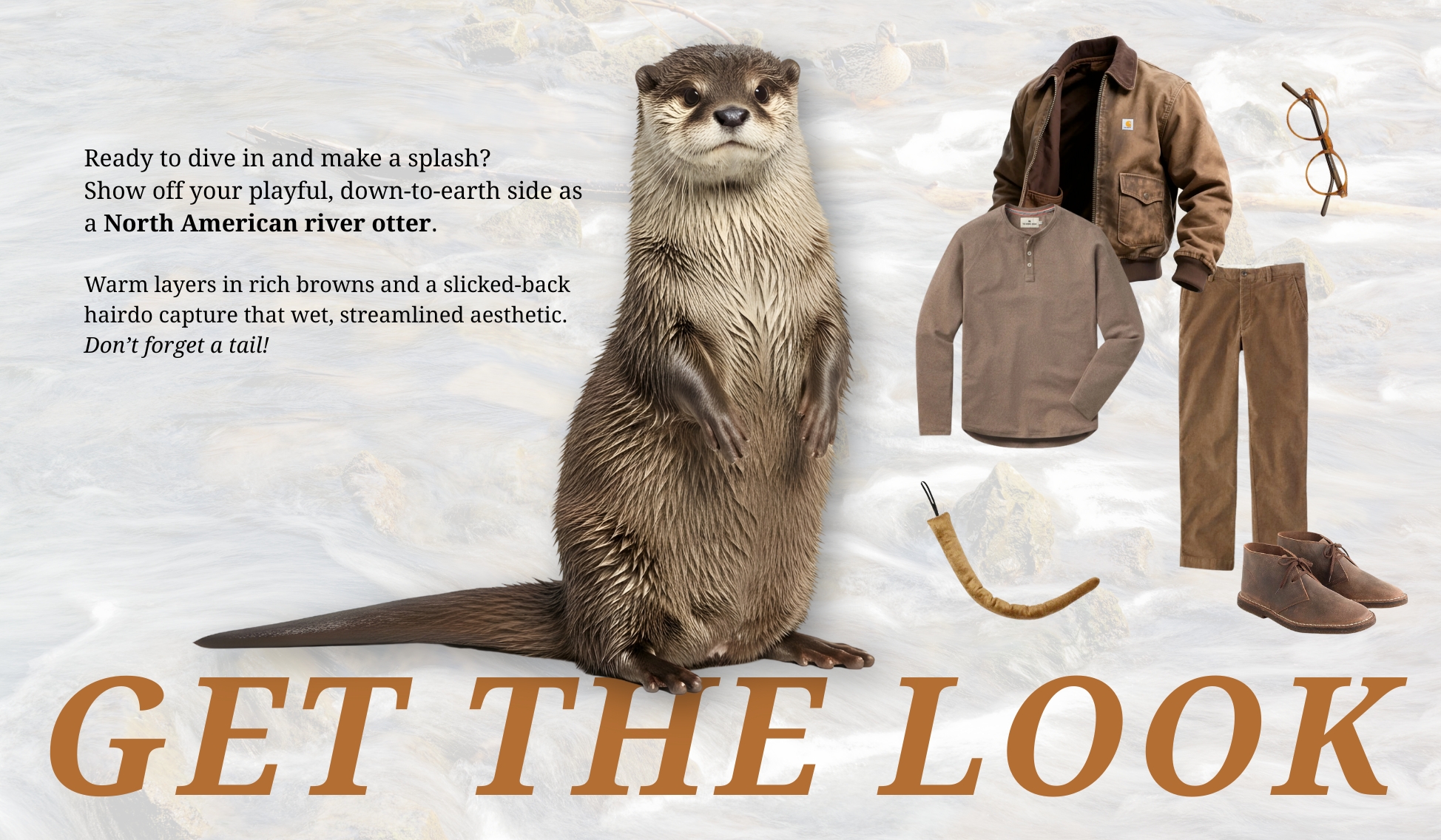 Now this is a wear-what-you-already-have costume — minus the tail, of course! Playful and approachable, the North American river otter inspires a cozy, layered look in warm browns and neutrals.