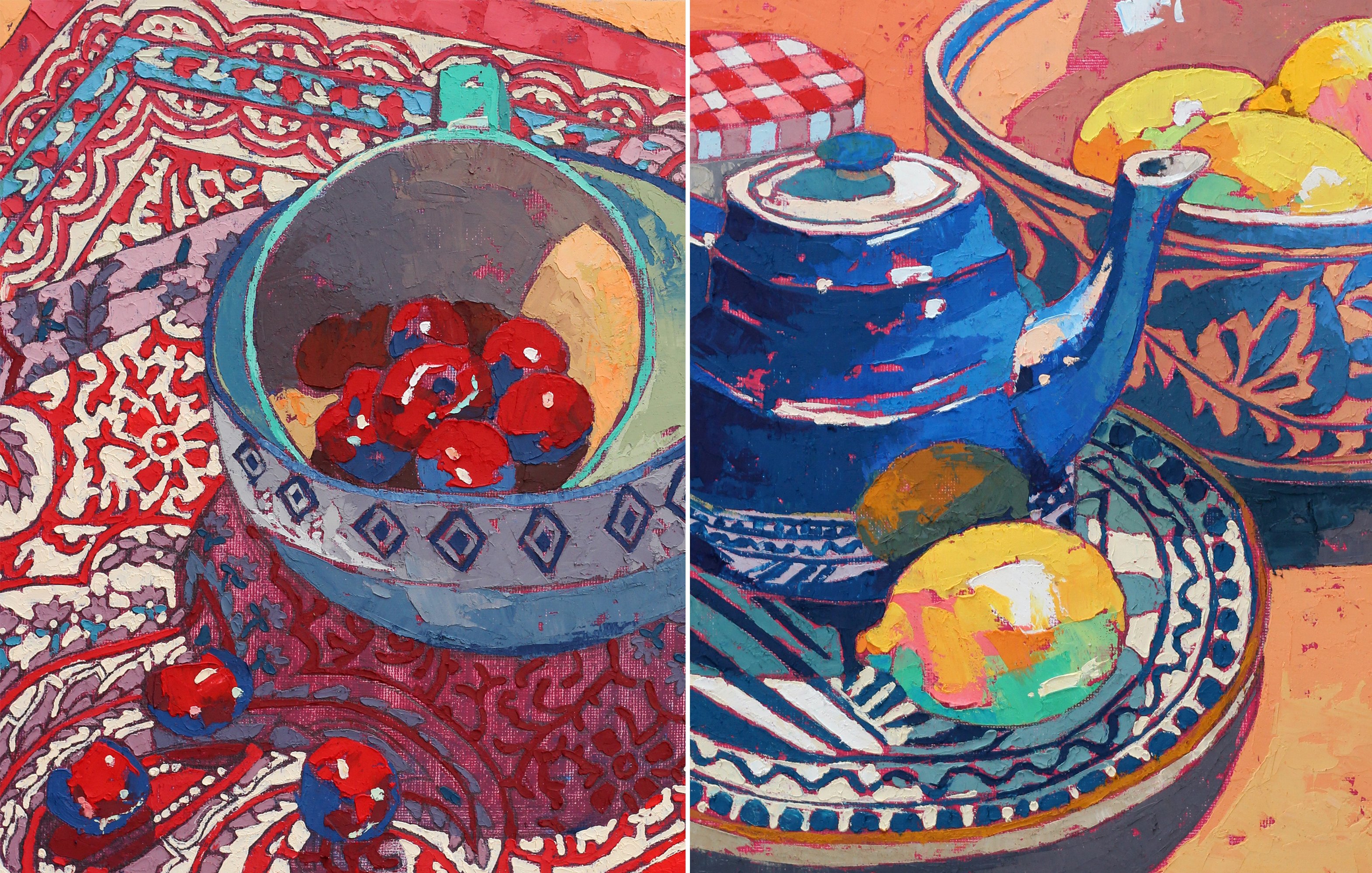 Well... Until recently. Since the pandemic has started I am obsessed with still life work. Isn’t that a bit on the nose? STILL LIFE. It's not that we don't get out. Like everyone else, we are scouring the All Trails app for lightly trafficked trails to head out to on weekends. But bringing home those big skies and valleys for inspiration to paint by just feels like a mockery of the moment. So lately it's lemons and cherries and peaches sitting on intricately patterned bowls and fabrics. Its tiny handheld bits of nature and the outside. The more detail the better. I can be hypnotized into another world. And hopefully I share that with the viewer.