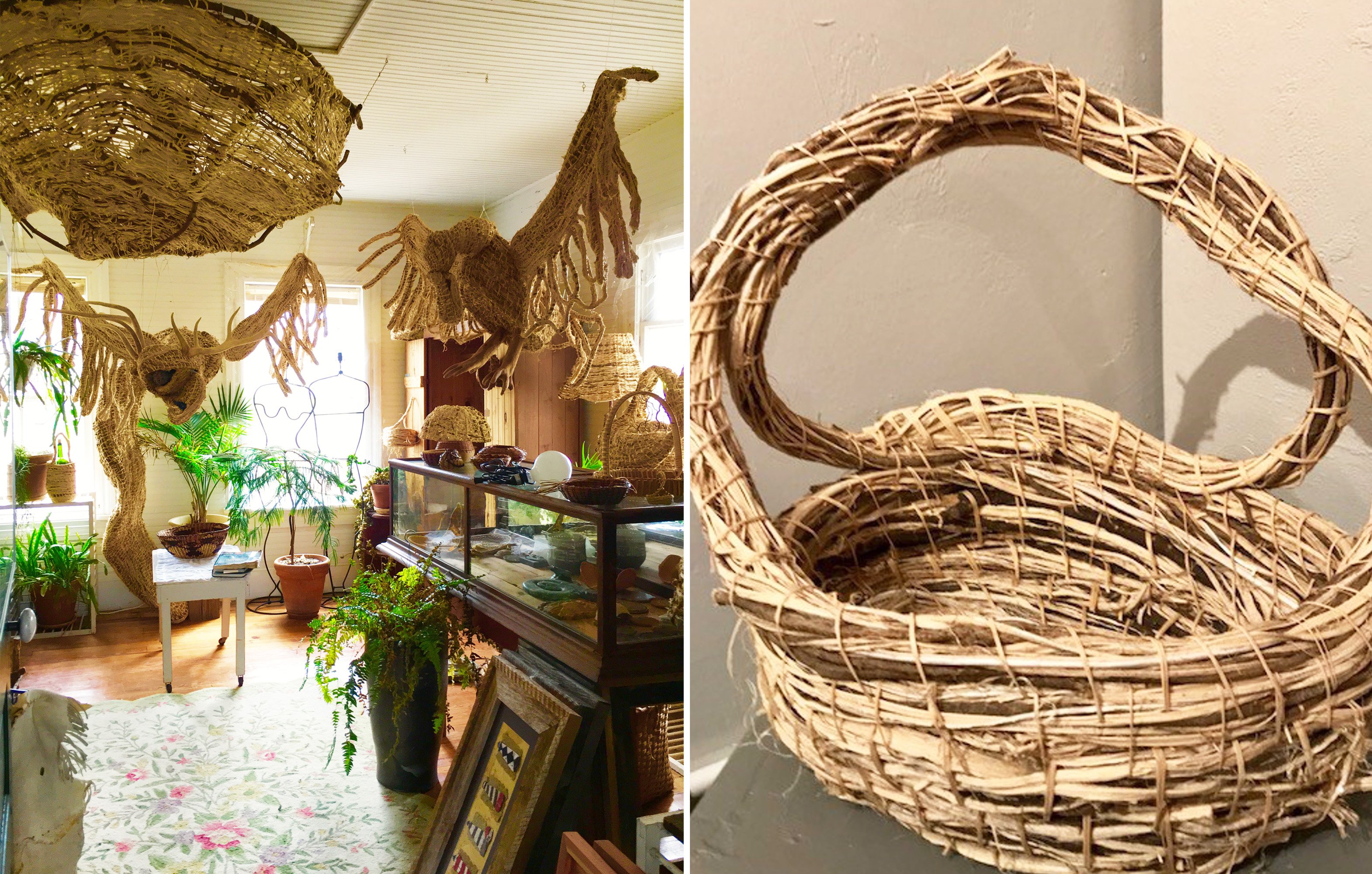 Kudzu is an amazing thing. It doesn’t care if there is a drought. It can grow 12 inches a day. Parts of the young plants can be eaten (I use the roots in a stir fry and the leaves in a quiche like you would spinach). But when the plants become bigger is when I use them in my work. I turn them into paper in the barn in my backyard, which is constructed from bales made of kudzu. I have a loom set up and I have even woven kudzu cloth. And, of course, I weave baskets and five-foot or larger shades from kudzu. There is so much you can do with it — the possibilities are endless. It has taught me to find what you think is a nuisance, and turn it into a treasure.