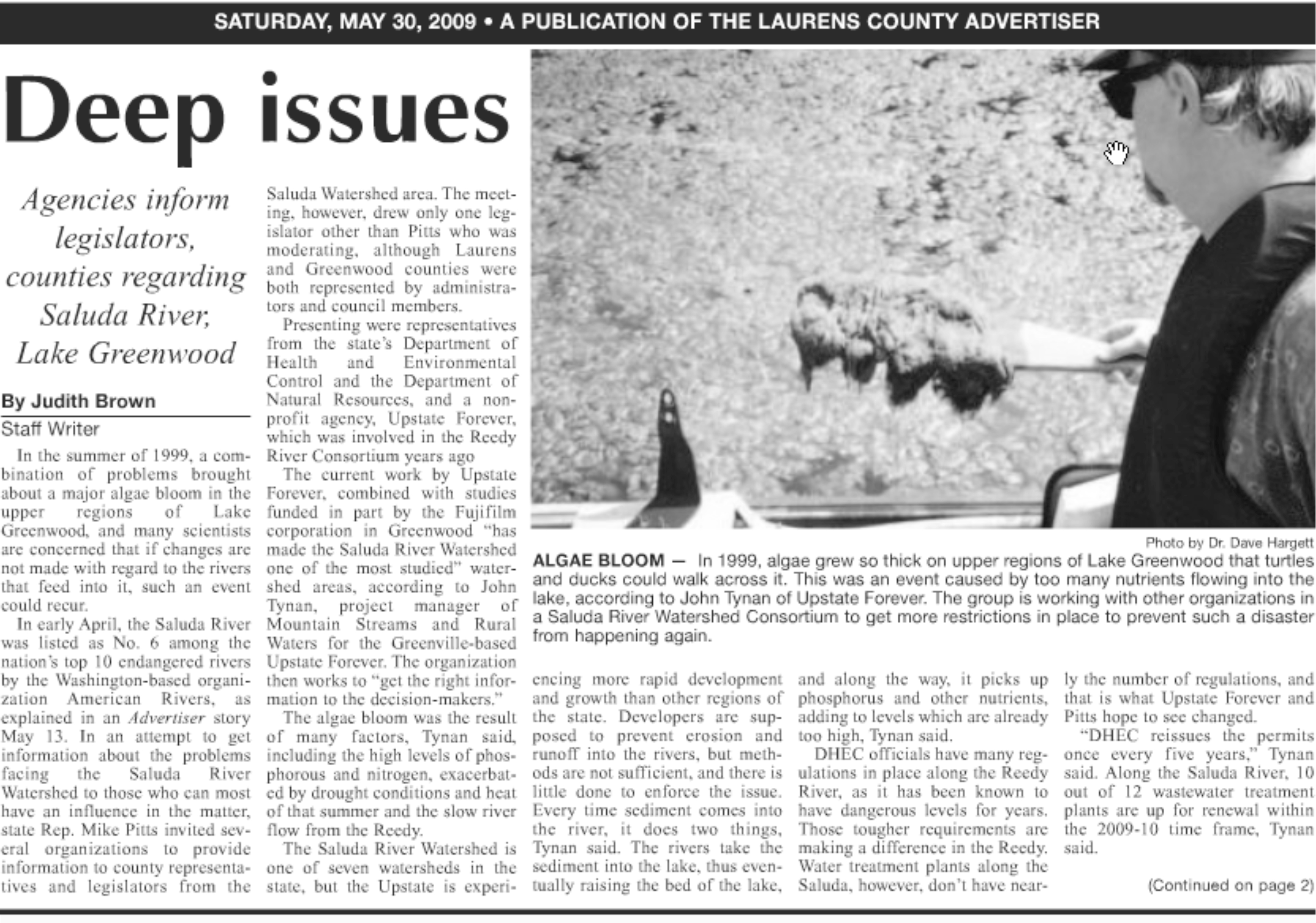 By 1999, Lake Greenwood was plagued by pollutants, causing algal blooms thick enough for turtles to walk on. The SRWC identified sediment deposition from upstream development and nutrients from stormwater and wastewater as key agents in the problems that have troubled Lake Greenwood.